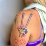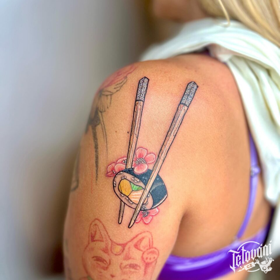 Tetování předměty, hůlky a sushi s květinami na rameni