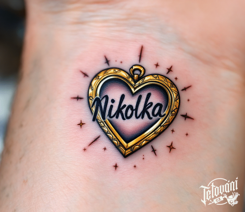 Tetování předměty, jména dětí v srdci, nápis Nikolka na zápěstí