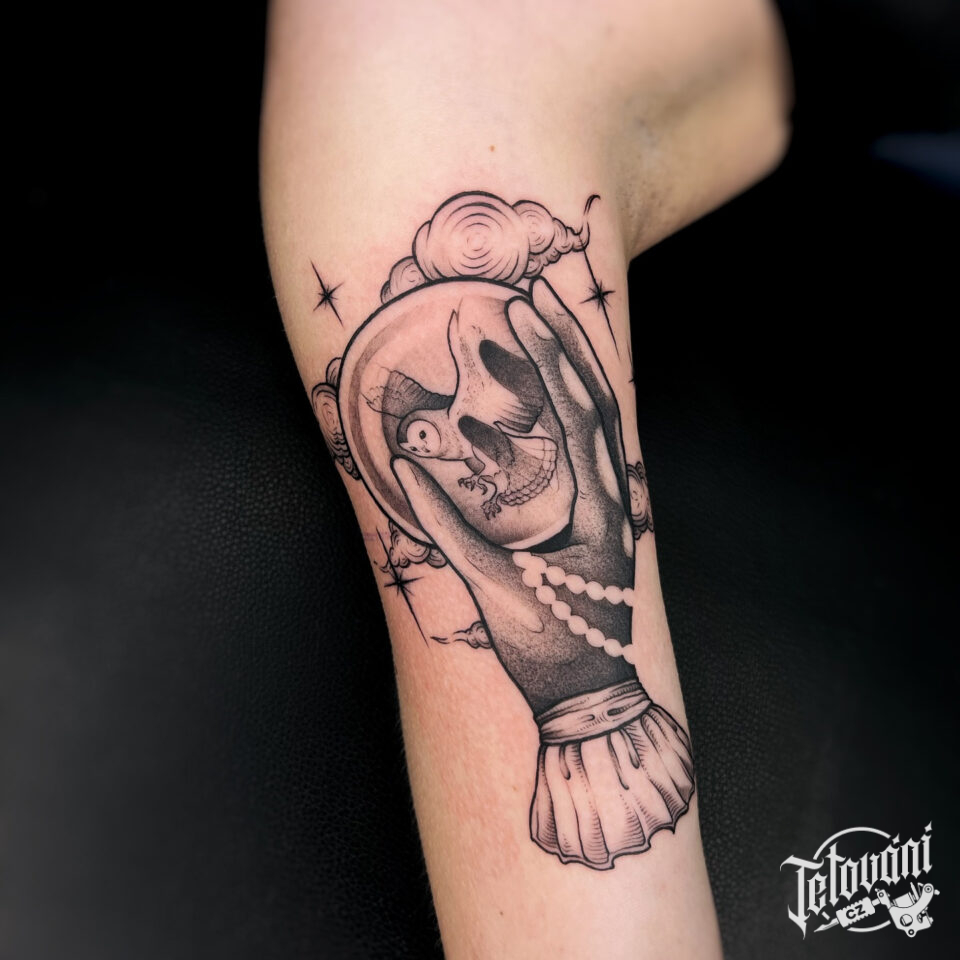Tetování předměty, křišťálová koule, ruka, zvíře, pták, sova na rameni