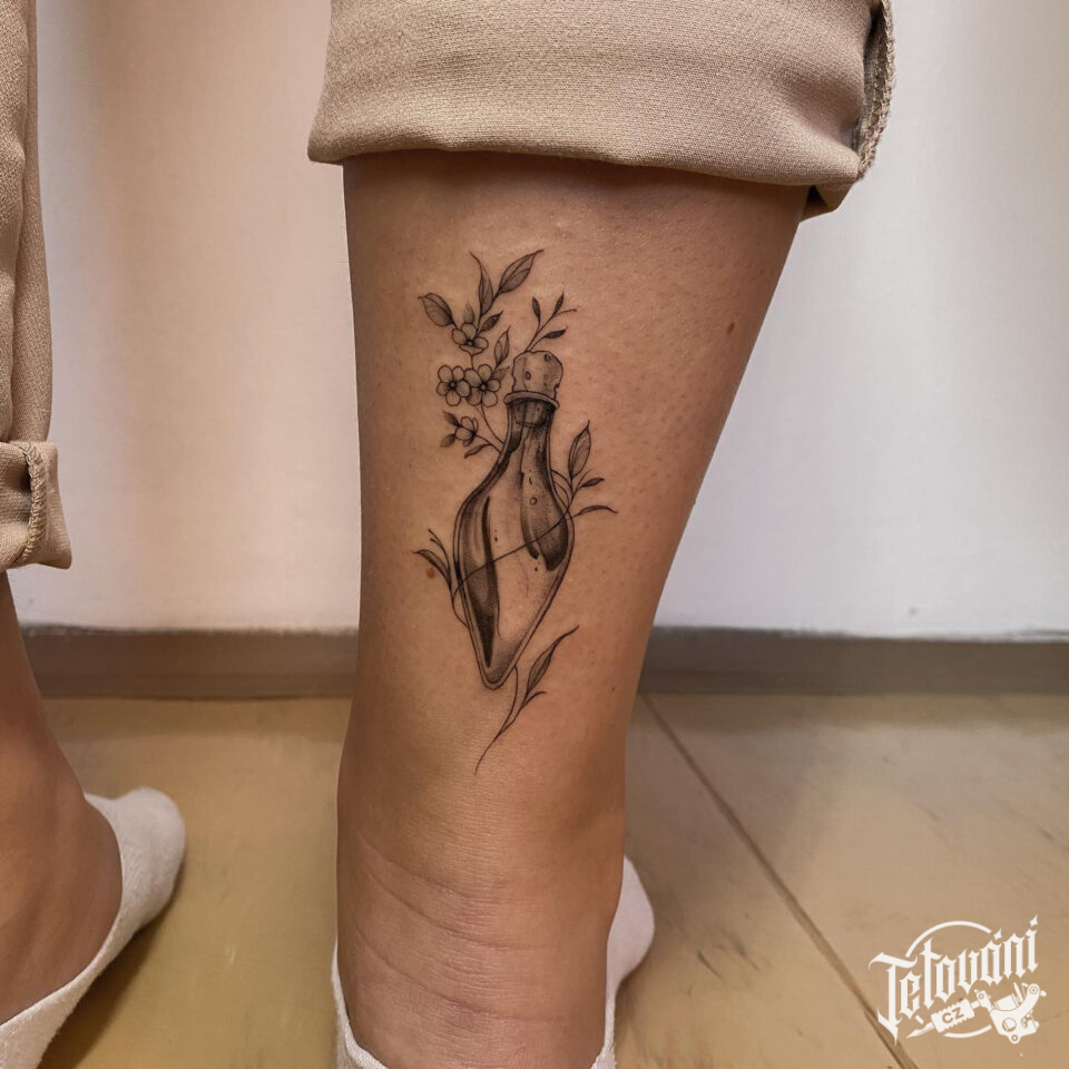 Tetování předměty, lahvička s elixírem z Harryho Pottera na lýtku