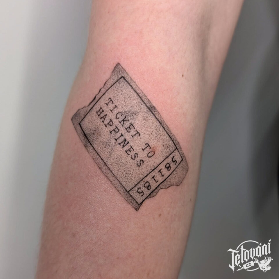 Tetování předměty, lístek s nápisy a čísly na předloktí