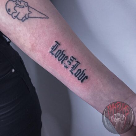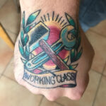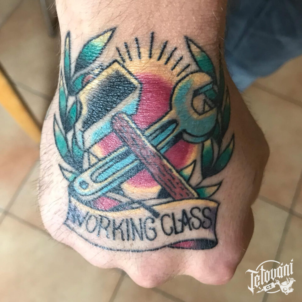 Tetování předměty, nářadí a nápis na hřbetu ruky