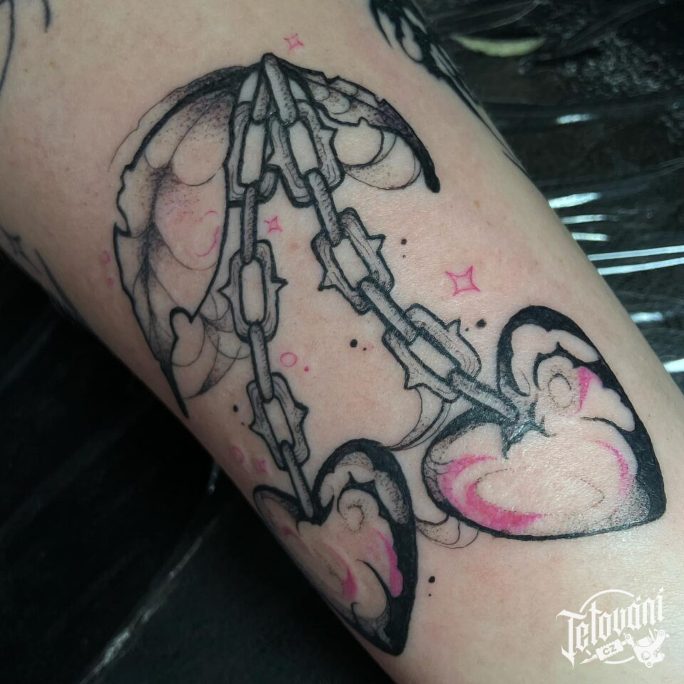 Tetování předměty, řetízek, přívěšek se srdcem na předloktí