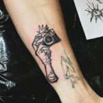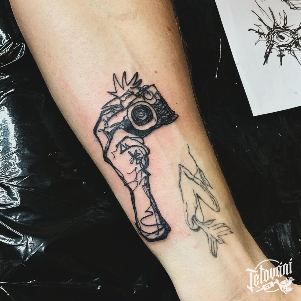 Tetování předměty, ruka a fotoaparát na předloktí