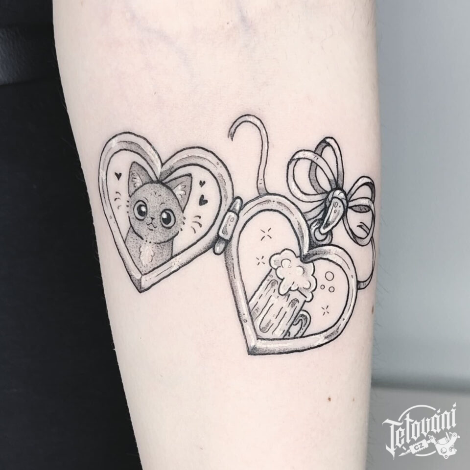 Tetování předměty, srdce, pivo, kočka na předloktí