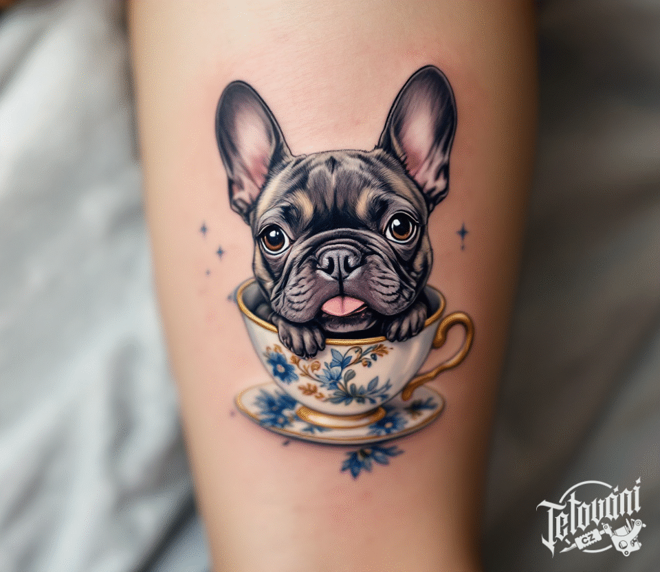 Tetování předměty, zvíře, pes, francouzský buldoček v šálku na lýtku