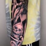 Tetování přesýpací hodiny, lebka, boží oko a ornamenty na rukávu