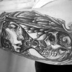 Tetování přesýpací hodiny, lebka, žena, křídla a ornamenty