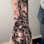 Tetování přesýpací hodiny, mýtická bytost, mýtická medúza na hřbetu ruky