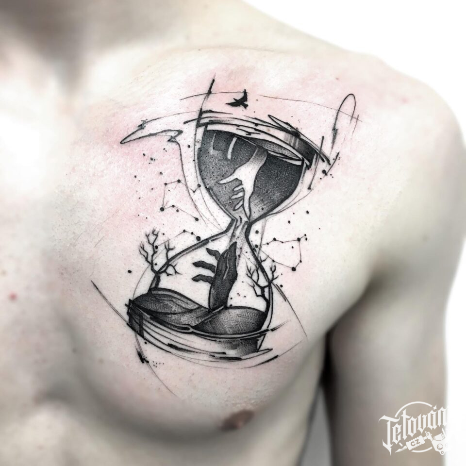Tetování přesýpací hodiny, ruce na prso