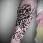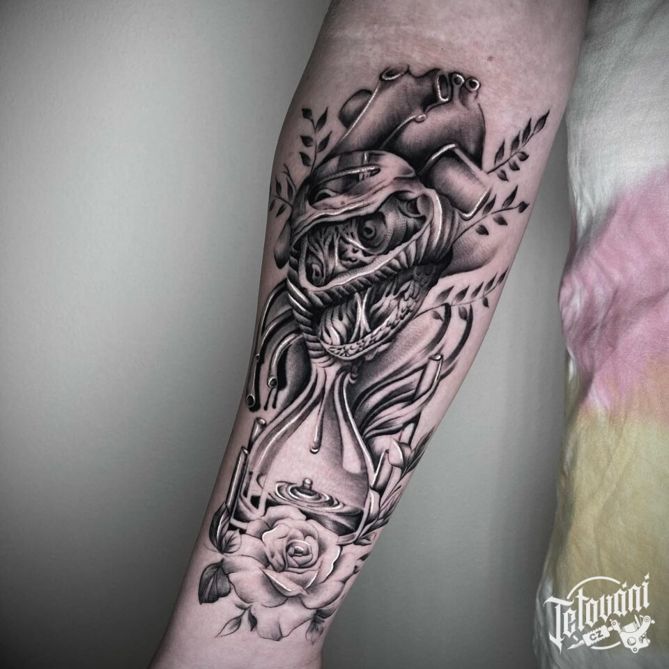 Tetování přesýpací hodiny, růže a srdce na předloktí