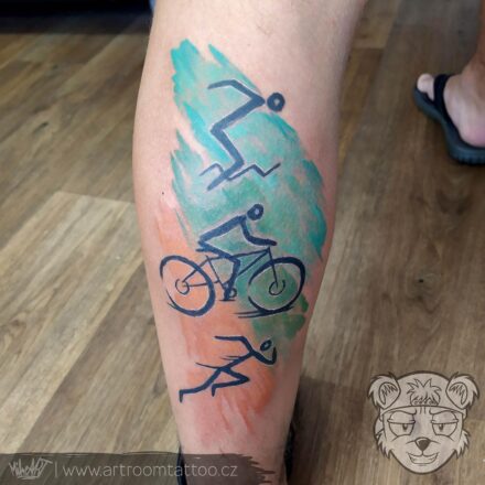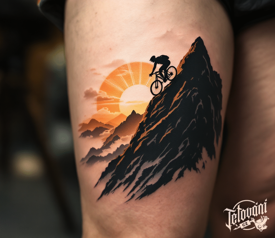 Tetování příroda a sport, hory, Slunce, cyklo na stehně