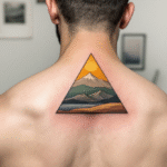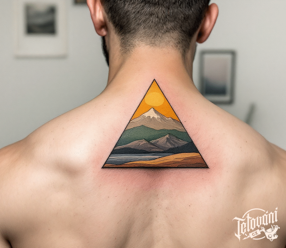 Tetování příroda a tvary, hory v trojúhelníku na zádech