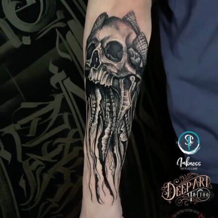 Tetování příroda a zvířata, chobotnice, žralok v moři, maják na předloktí