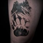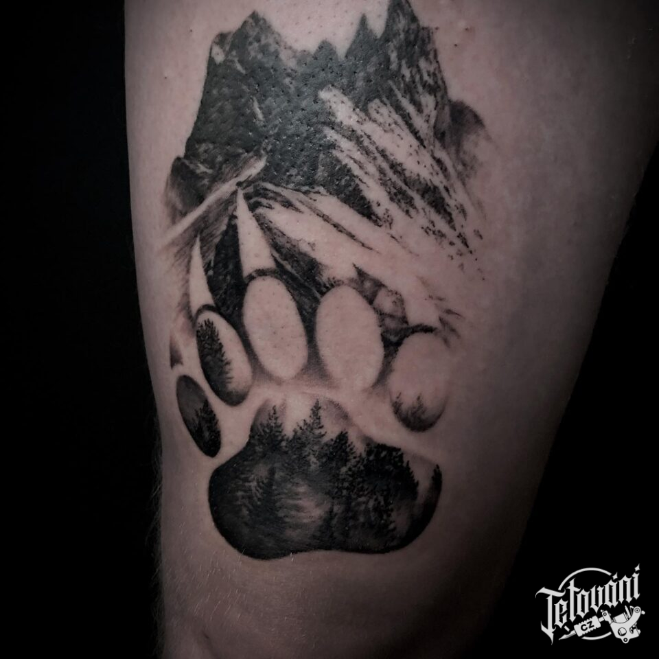 Tetování příroda a zvířata, hory a psí tlapka na stehně