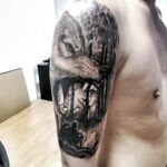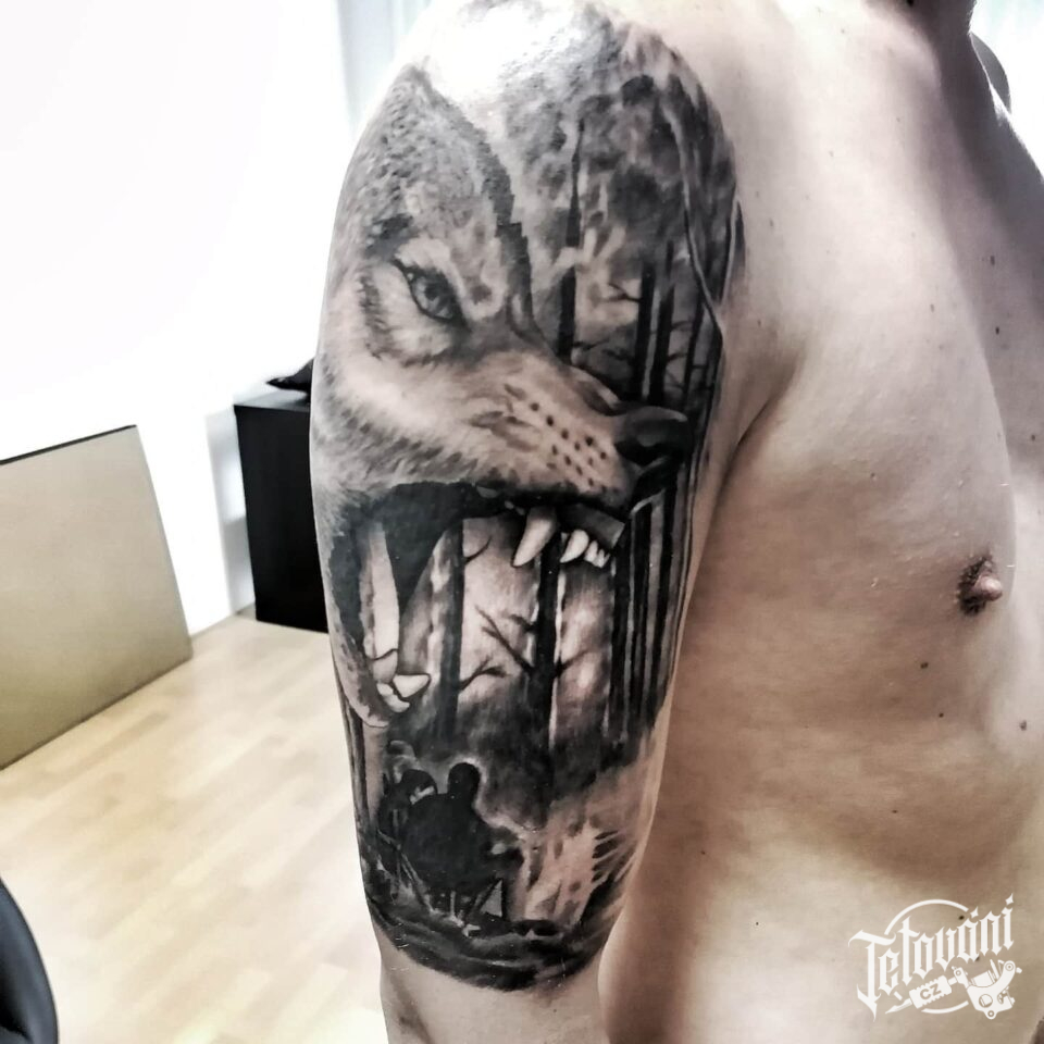 Tetování příroda a zvíře, hlava vlka, les na rameni