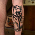 Tetování příroda a zvíře, hory a vlk na lýtku