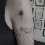 Tetování příroda, hory a černé Slunce na rameni