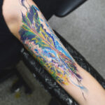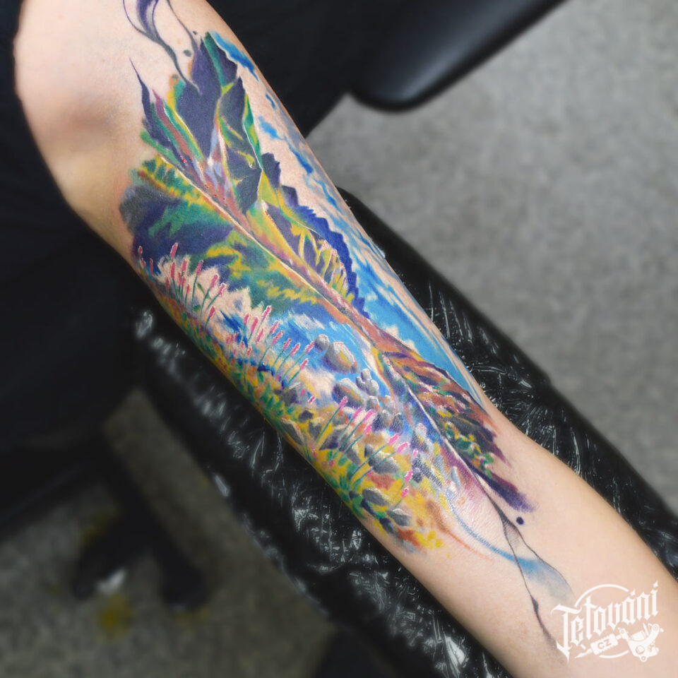 Tetování příroda, hory a jezero na paži