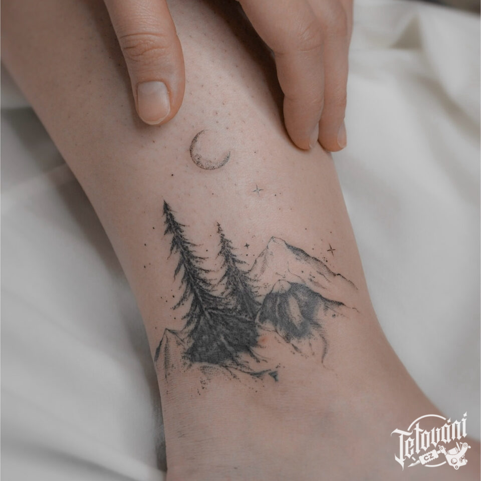 Tetování příroda, hory a les na kotníku