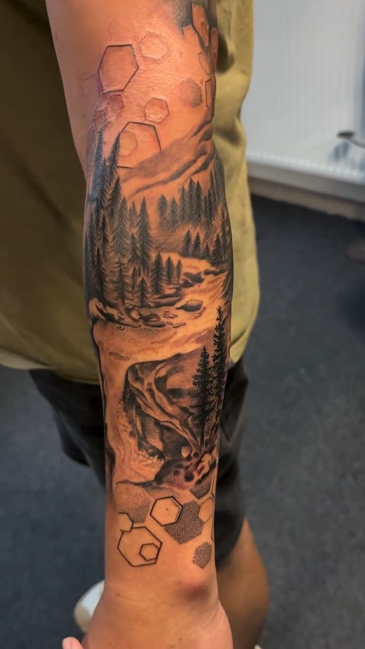 Tetování příroda, hory a les na ruce
