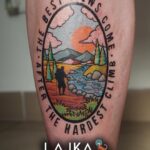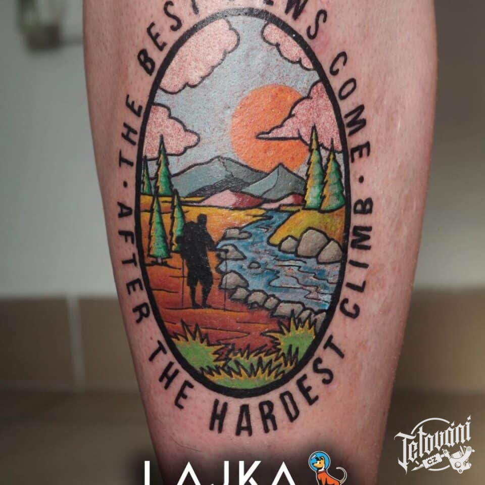 Tetování příroda, hory a nápisy na holeni