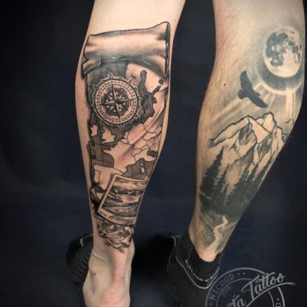 Tetování příroda, hory, les, kompas, cestování na předloktí