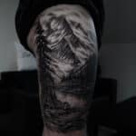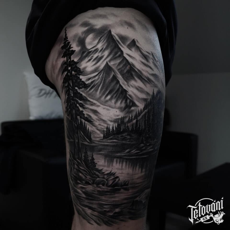 Tetování příroda, hory, les na bok stehna