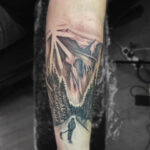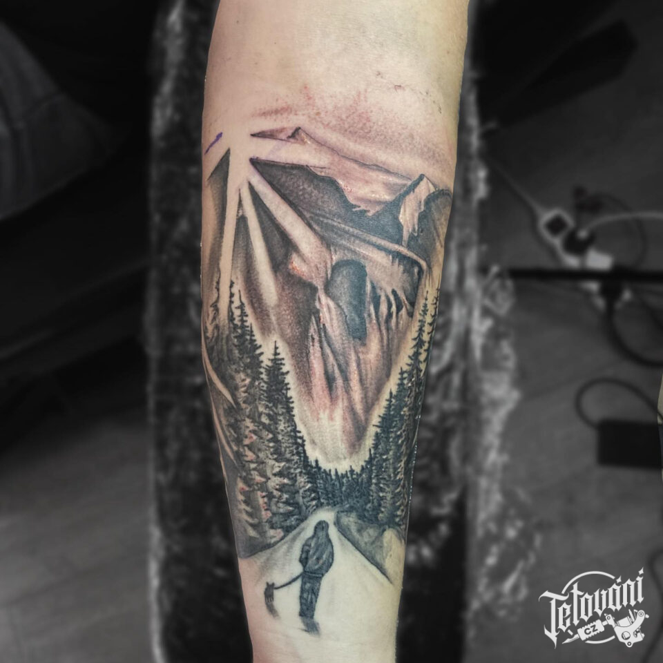 Tetování příroda, hory, les na předloktí