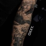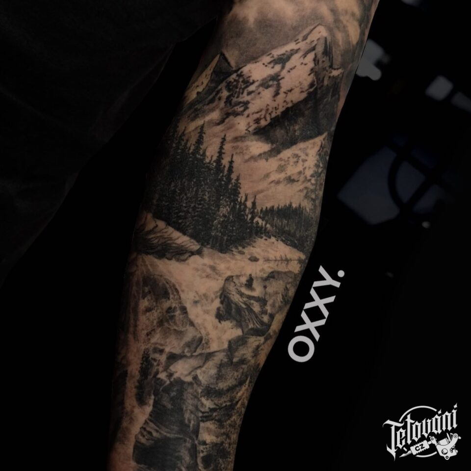 Tetování příroda, hory, les na předloktí