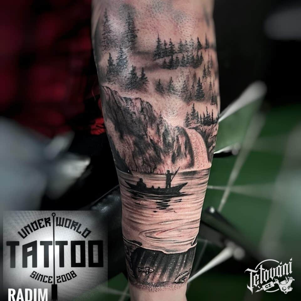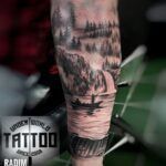Tetování příroda, hory, les na předloktí
