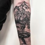 Tetování příroda, hory, les, zvíře jelen na předloktí