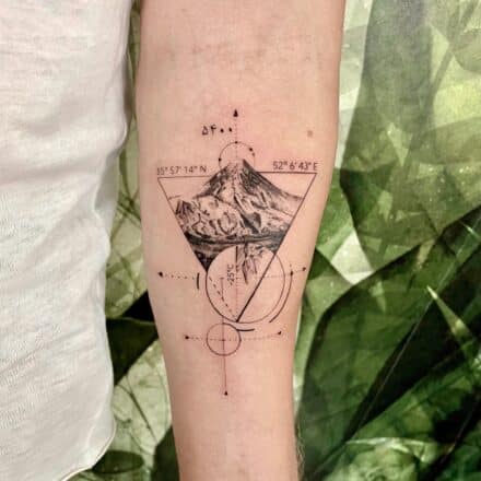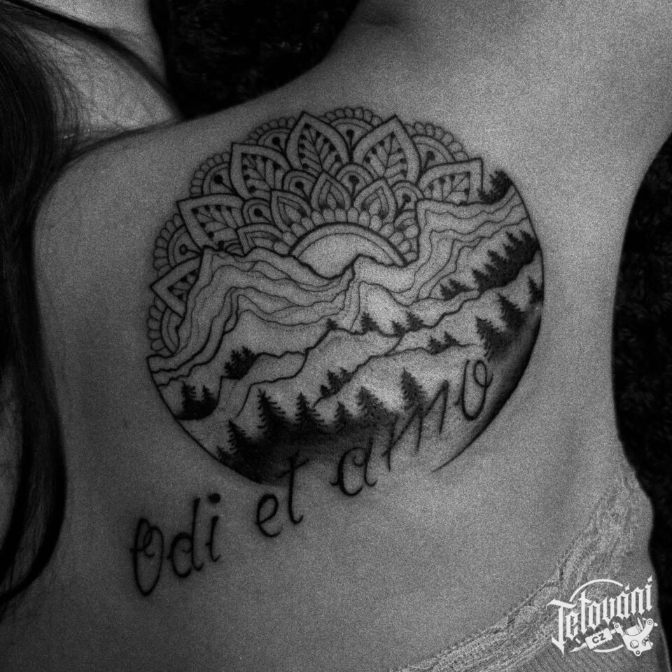 Tetování příroda, hory, mandala, nápis na rameni