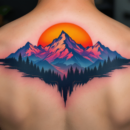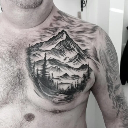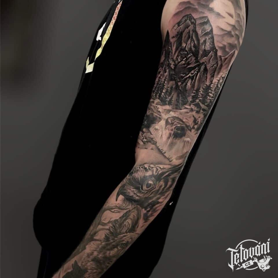 Tetování příroda, hory, měsíc, sova, vlk, pes a stromy na rukávu