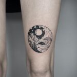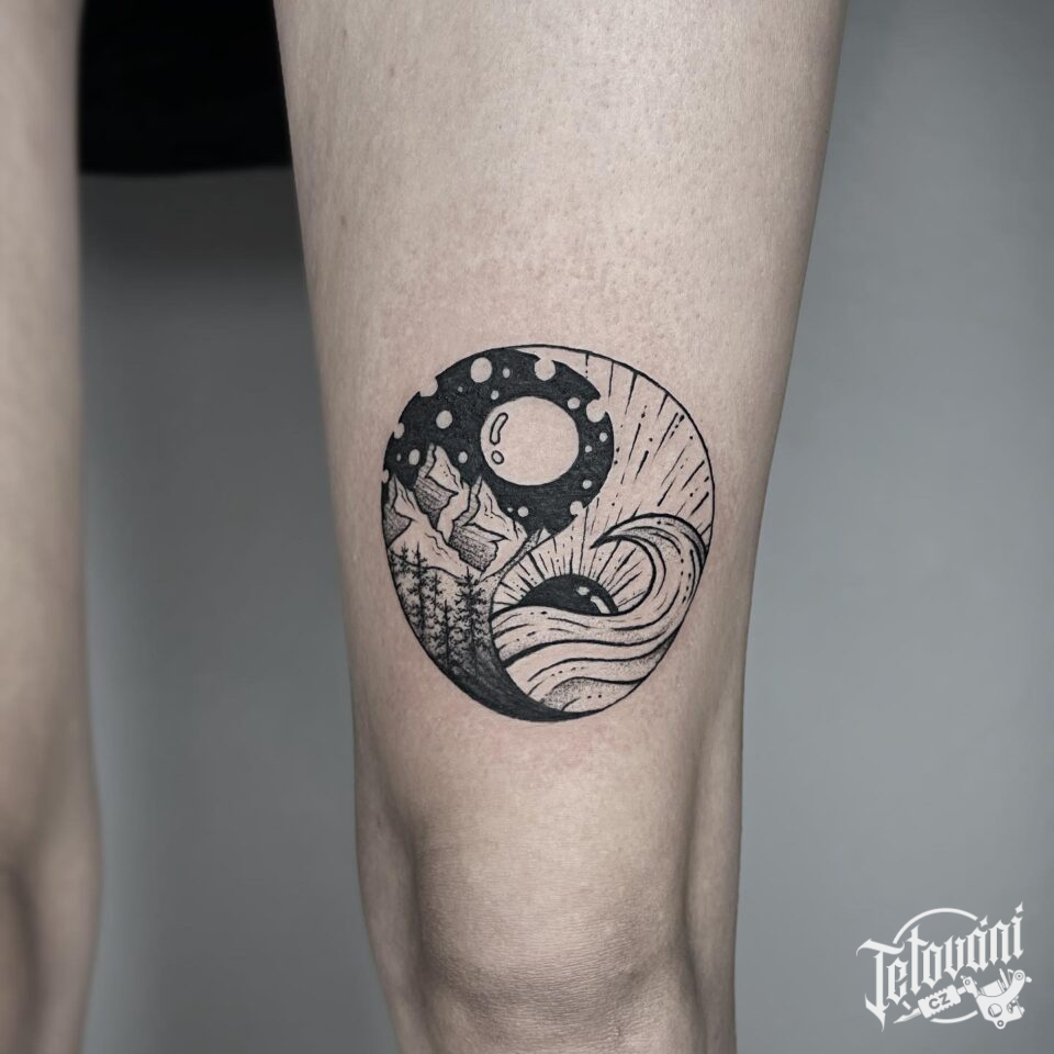 Tetování příroda, hory, měsíc, tvary na stehno