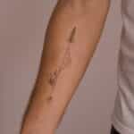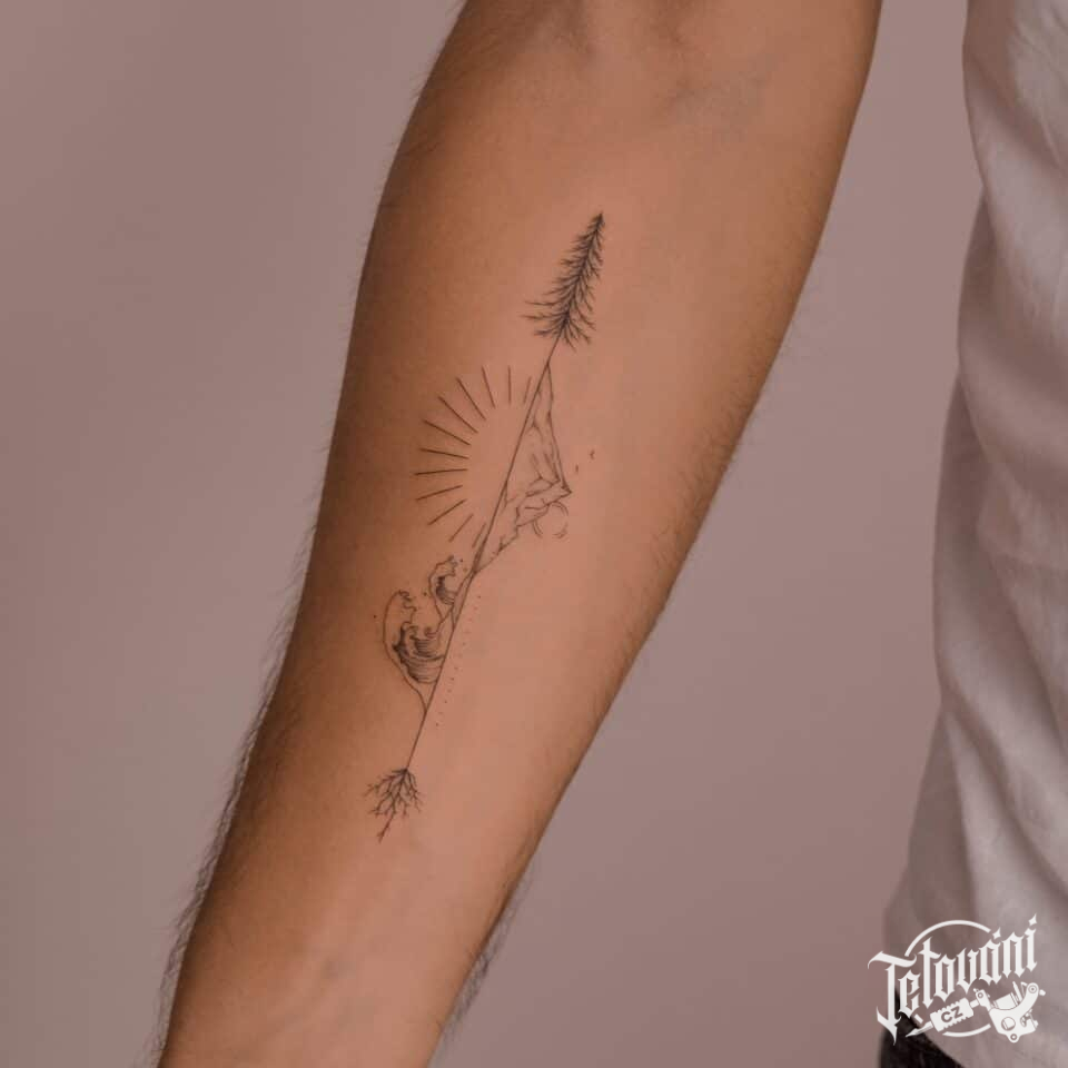 Tetování příroda, hory, moře, Slunce, strom na předloktí