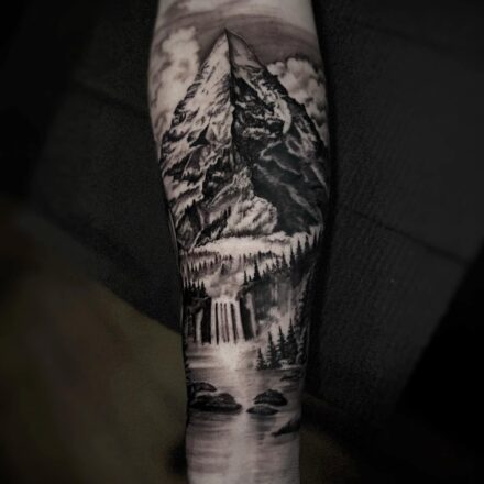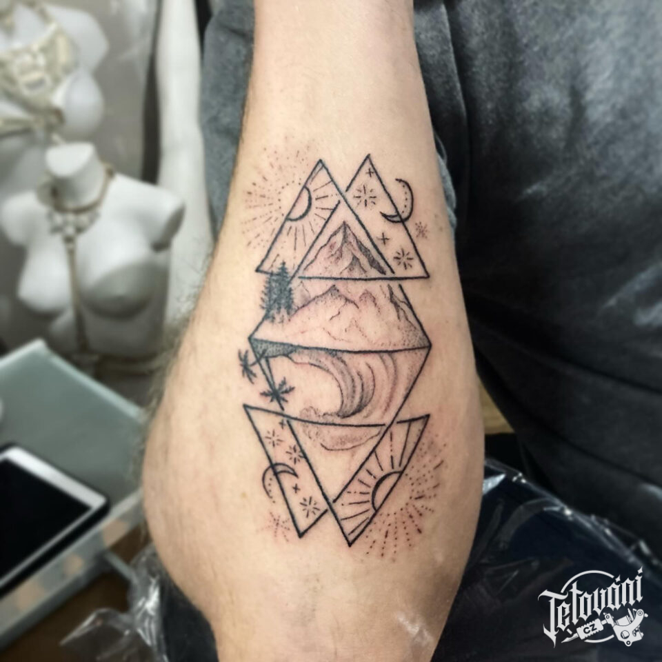 Tetování příroda, hory, moře, tvary, trojuhelníky na předloktí