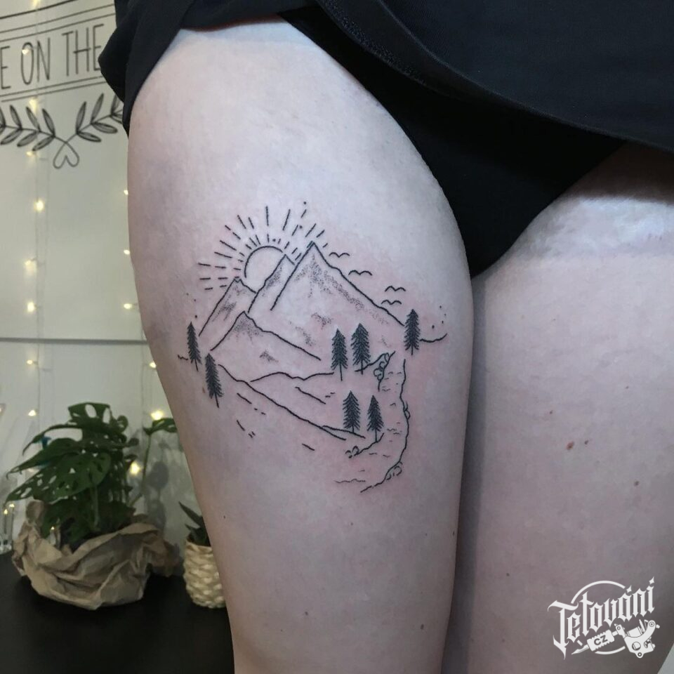Tetování příroda, hory na stehně