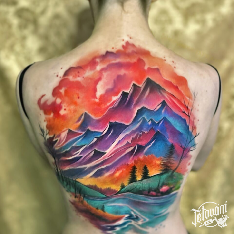 Tetování příroda, hory na zádech