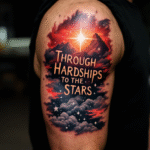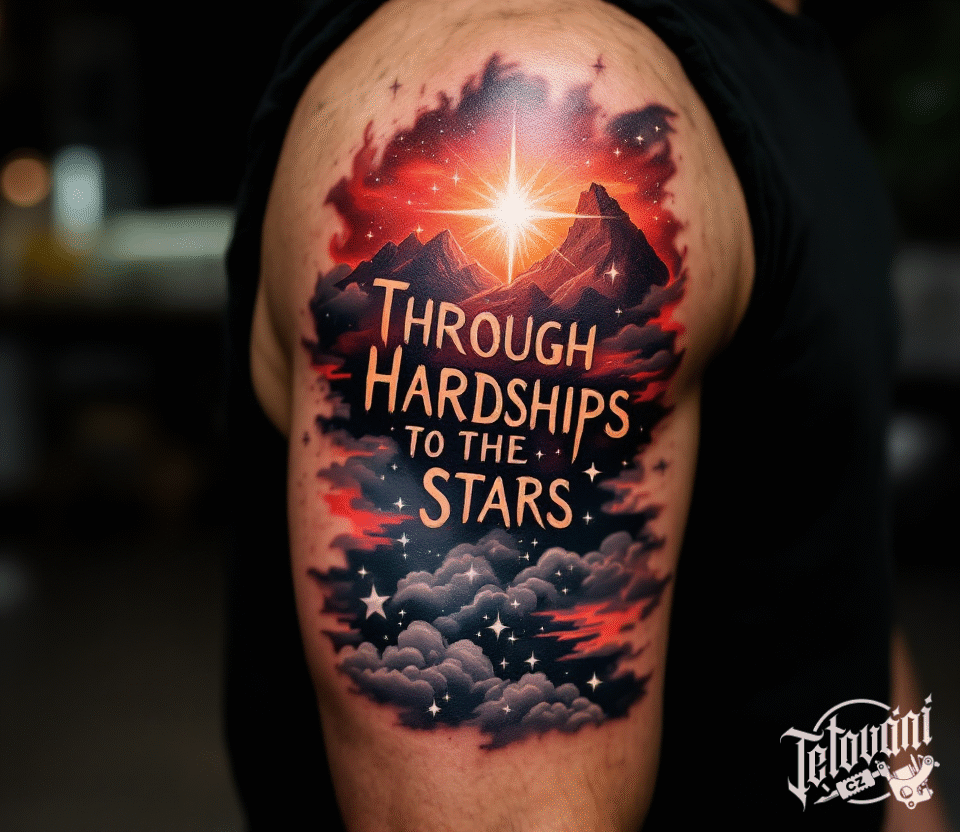 Tetování příroda, hory, nápis přes překážky ke hvězdám, motivační motto na rameno