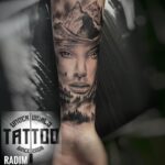 Tetování příroda, hory, portrét ženy na předloktí
