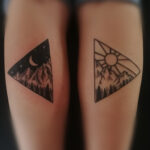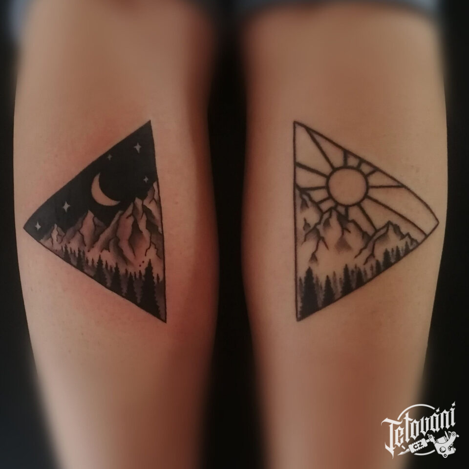 Tetování příroda, hory, Slunce a Měsíc, trojúhelníky na lýtku