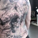 Tetování příroda, hory, žena, zvířata, orel, vlk a měsíc na zádech