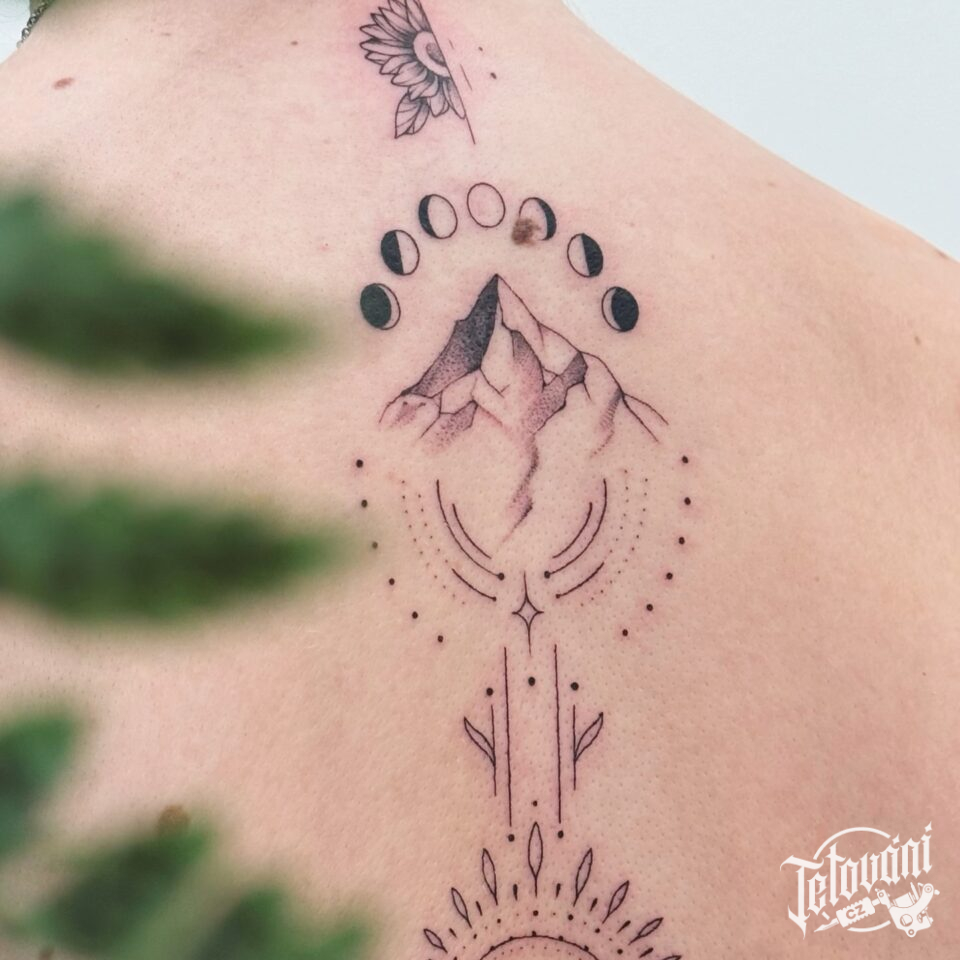 Tetování příroda, hory, znaky a symboly na páteř