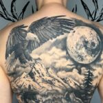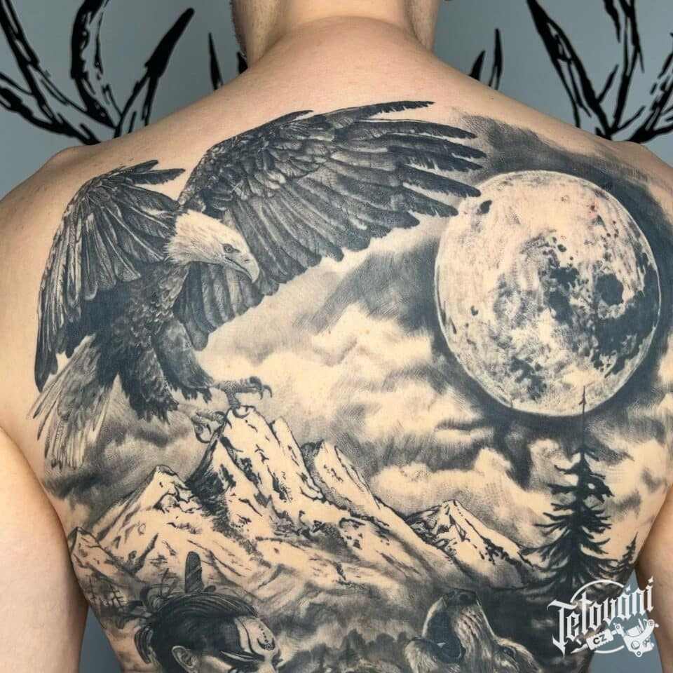 Tetování příroda, hory, zvířata, pták, orel a měsíc na zádech