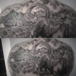 Tetování příroda, hory, zvíře kamzík na záda