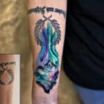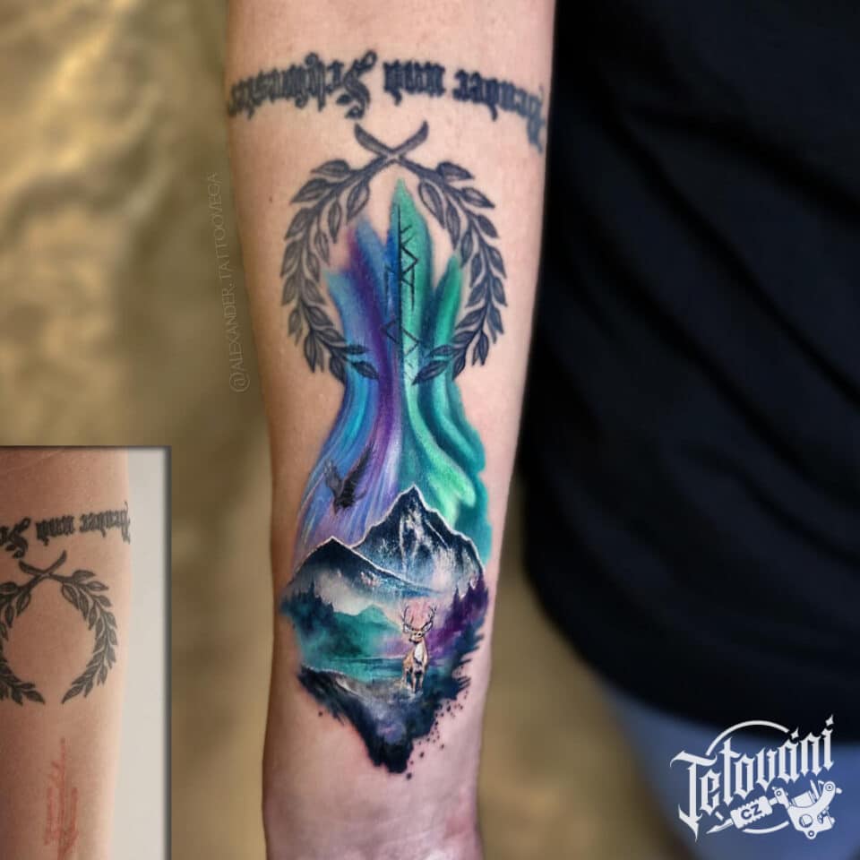 Tetování příroda, hory, zvíře, vesmír na předloktí