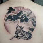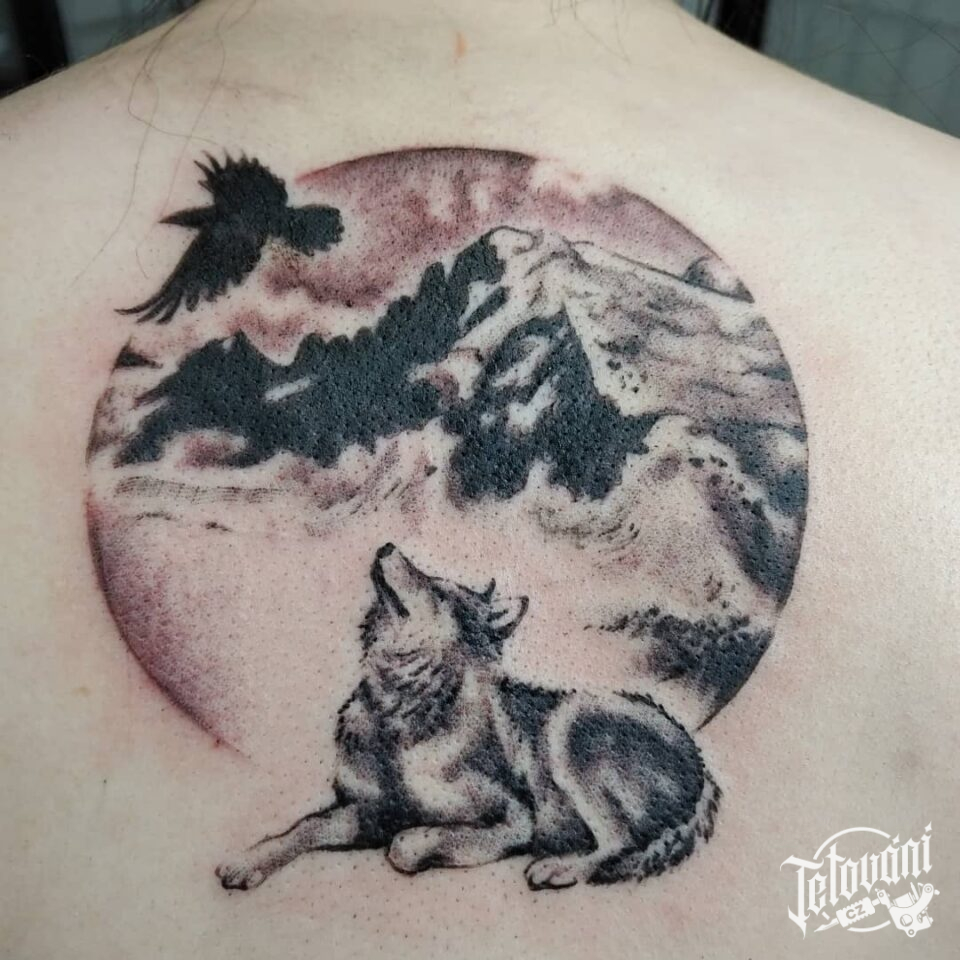 Tetování příroda, hory, zvíře vlk a orel na záda