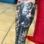 Tetování příroda, lebka, les na lýtku