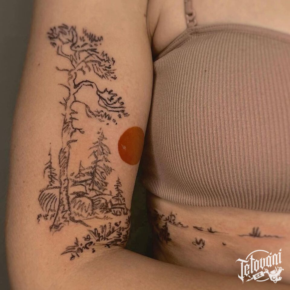 Tetování příroda, les a slunce na paži